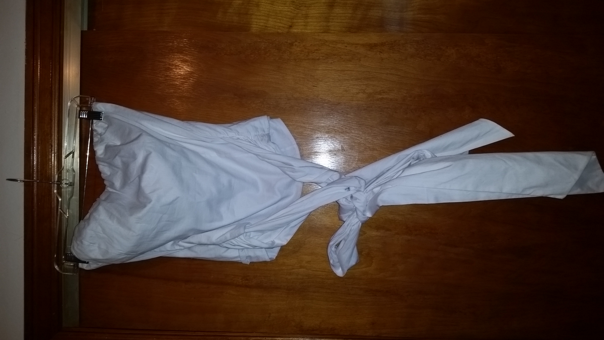 Strapless top w/side zipper. Top has long sash that can be wrapped around the waist to make a large bow. Pair w/white crop jeans for a cute casual look for an all white party or date night!